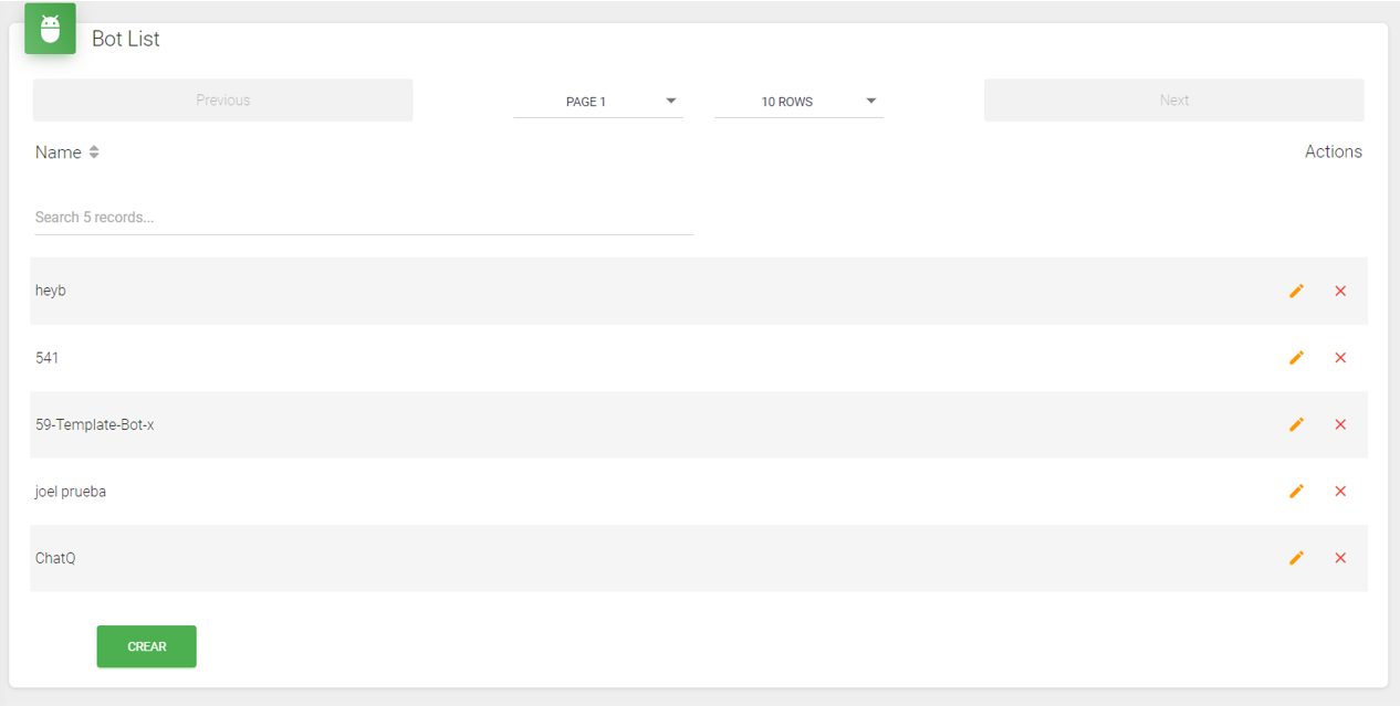 Al ingresar a esta p谩gina se podr谩 ver r谩pidamente una lista de todos los bots que han sido programados, y a su vez se tendran las opciones de crear, editar, o eliminar un bot. Para editar o eliminar un bot, basta con hacer click al 铆cono correspondiente en la lista.