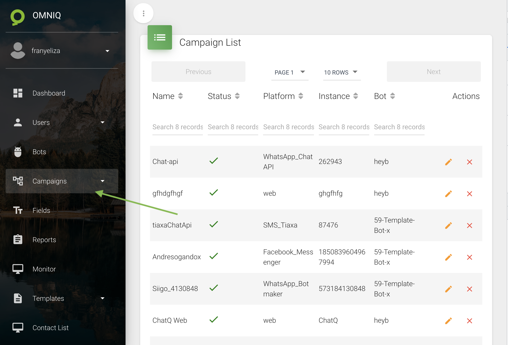 - Dirigirse a la opción "Campaigns" que se encuentra en el menú de la izquierda de la aplicación Omni-Q. Ahi se mostrarán todas las campañas existente como se enseña a continuación