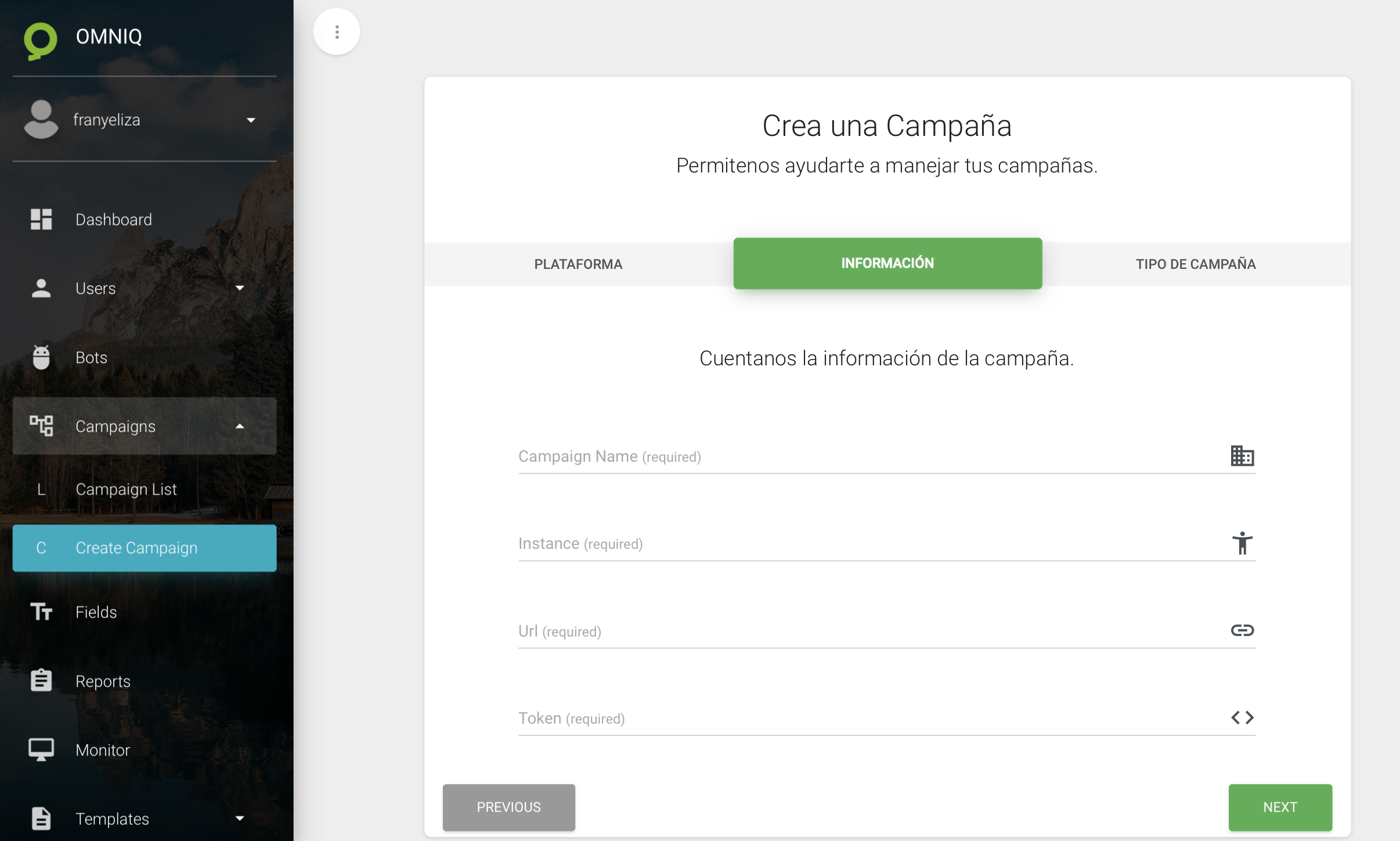 En esta sección se mostrará como crear una campaña correctamente. Las campañas permiten establecer el canal de conexión que estará entre el cliente y el robot. Estos canales pueden ser: Whatsapp, Facebook, Twitter, SMS, Instagram, Website, Telegram, Facebook Messenger.