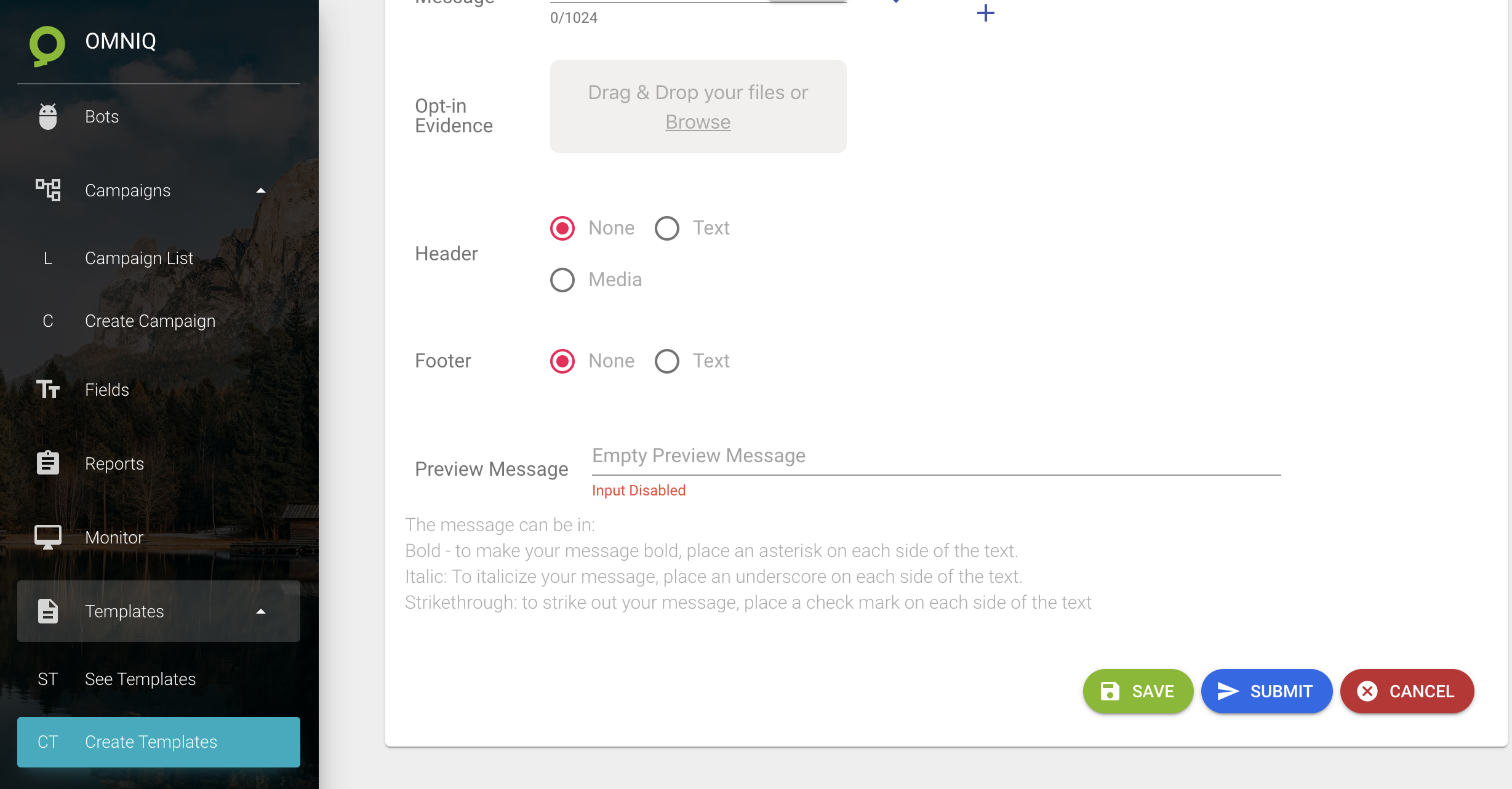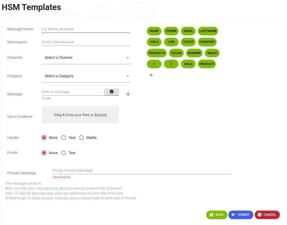 Luego de llenar la informaci贸n necesaria de la plantillas, se tiene la opci贸n de cancelar la plantilla mediante el bot贸n "CANCEL", guardar la plantilla para futura modificaci贸n mediante el bot贸n "SAVE", o enviar la plantilla para aprobaci贸n mediante el bot贸n "SUBMIT".