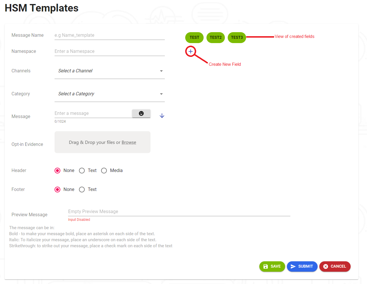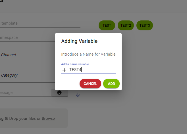 Al configurar una plantilla se tiene la opci贸n de utilizar campos variables ya establecidos y de crear alg煤n campo variable. A estas variables solo se les debe de asignar un valor al momento de enviar el mensaje y se reflejara en todos los mensajes de los templates.